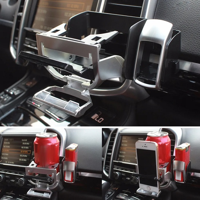 Ποτηροθήκη αυτοκινήτου με βάση κινητού και θήκη τσιγάρων, πλαστική, με πρακτικό σχεδιασμό και εύκολη, σταθερή τοποθέτηση στις περσίδες των αεραγωγών του αυτοκινήτου, χάρη στο ειδικό κλιπ που διαθέτει.