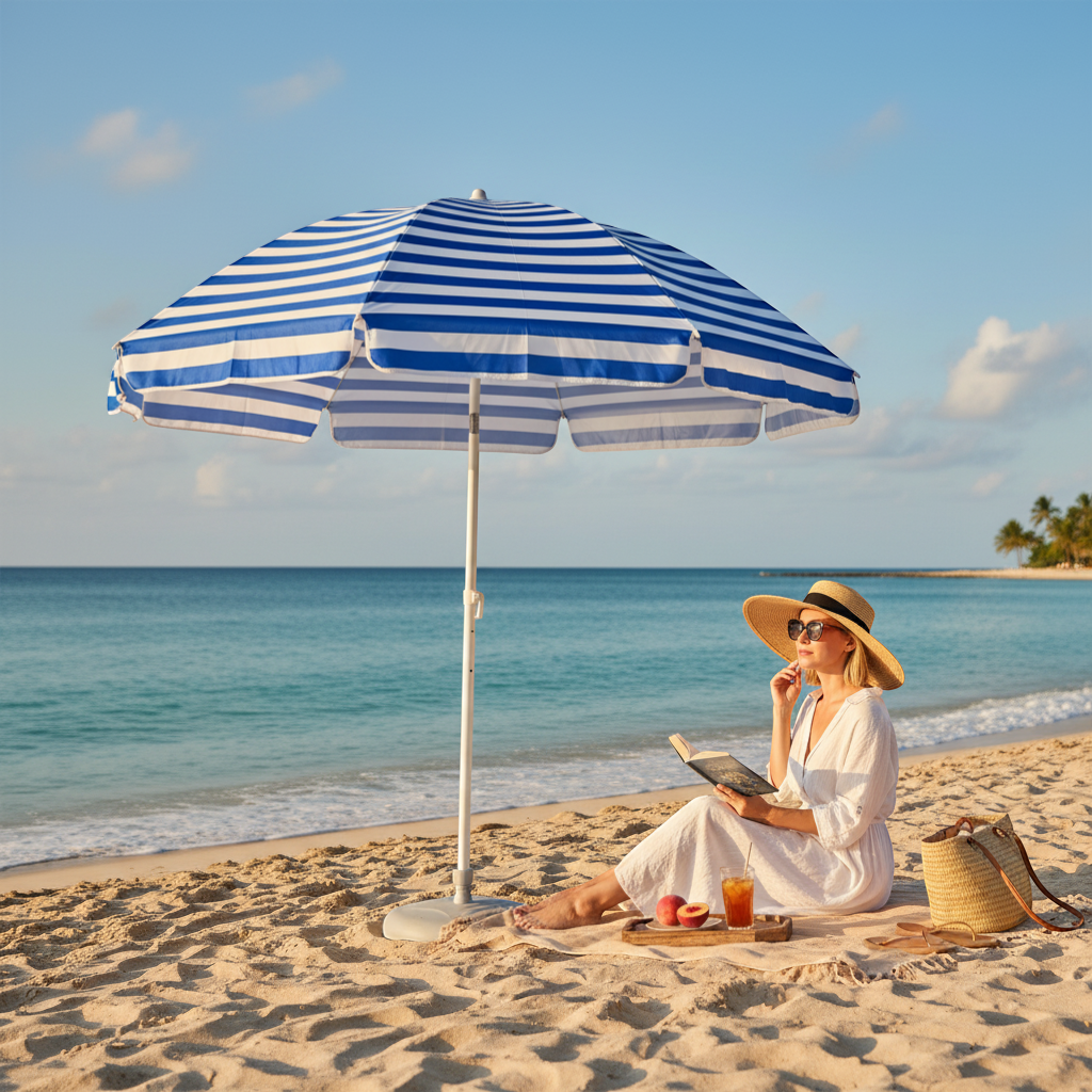 Ομπρέλα θαλάσσης, ιδανική για την παραλία, το camping ή τον κήπο σας. Με πανί από 100% αδιάβροχο πολυεστερικό ύφασμα.