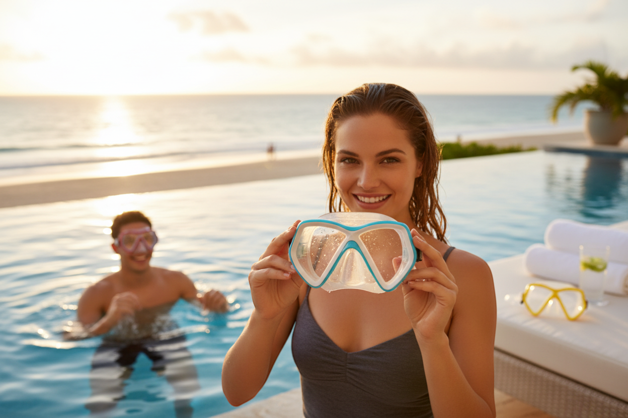Μάσκα θαλάσσης πλαστική, με πλήρη κάλυψη μύτης, με μαλακή υποαλλεργική σιλικόνη περιμετρικά και ρυθμιζόμενο λουρί κεφαλής για άνετη, σταθερή εφαρμογή και απόλυτη στεγανότητα.