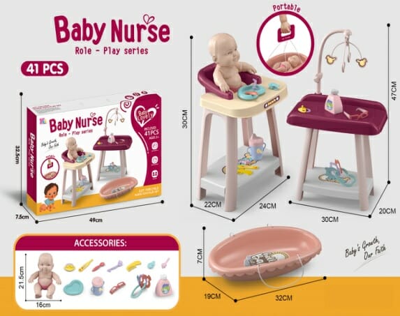 Πλήρες σετ φροντίδας μωρού με κούκλα, καρεκλάκι φαγητού, αλαξιέρα και καλάθι-κρεβατάκι. Περιλαμβάνει όλα τα απαραίτητα αξεσουάρ για την ολοκληρωμένη φροντίδα και την περιποίηση του μωρού σου!