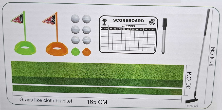 Παιδικό σετ Golf 2 παικτών, με τεχνητό γρασίδι παιχνιδιού μήκους 1.65m και όλα τα απαραίτητα αξεσουάρ για τους μικρούς λάτρεις του αθλήματος.