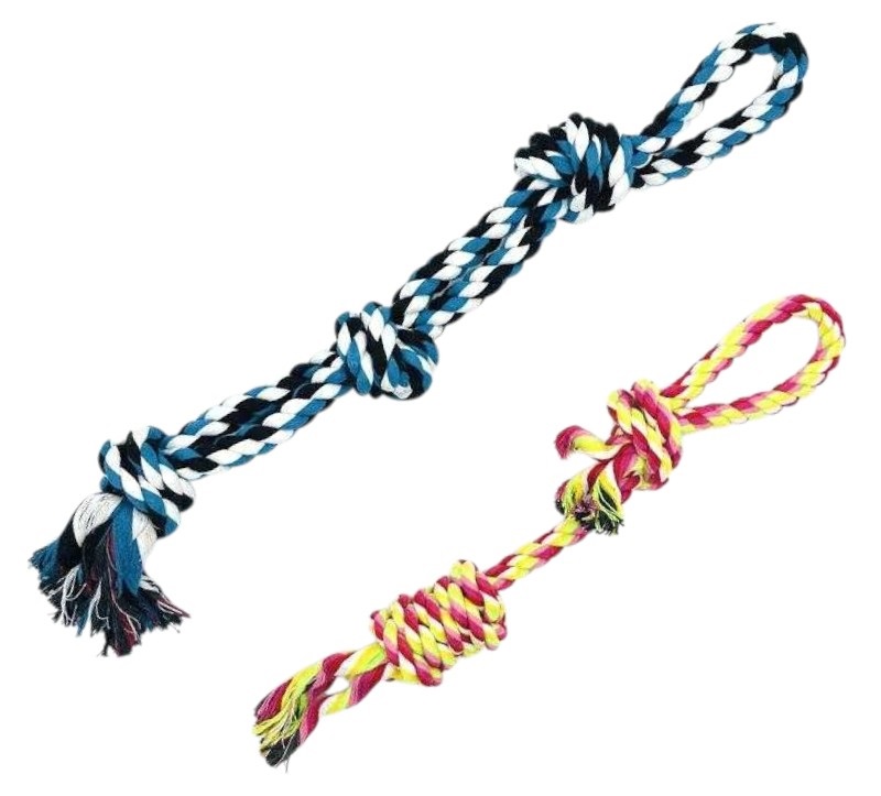 Παιχνίδι σκύλου σχοινί με κόμπους, από ανθεκτικό, μη τοξικό υλικό, ιδανικό για παιχνίδια τραβήγματος/αντίστασης ενώ παράλληλα βοηθά στην υγιεινή στόματος του σκύλου σας καθώς καθαρίζει ήπια και απασχολεί τα δόντια του. Συνολικό μήκος: 60cm.
