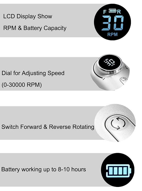 Επαγγελματικός, επαναφορτιζόμενος τροχός μανικιούρ με ρυθμιζόμενη ταχύτητα, λειτουργία μειωμένου θορύβου και δονήσεων και εργονομικό σχεδιασμό για εύκολη και άνετη χρήση.